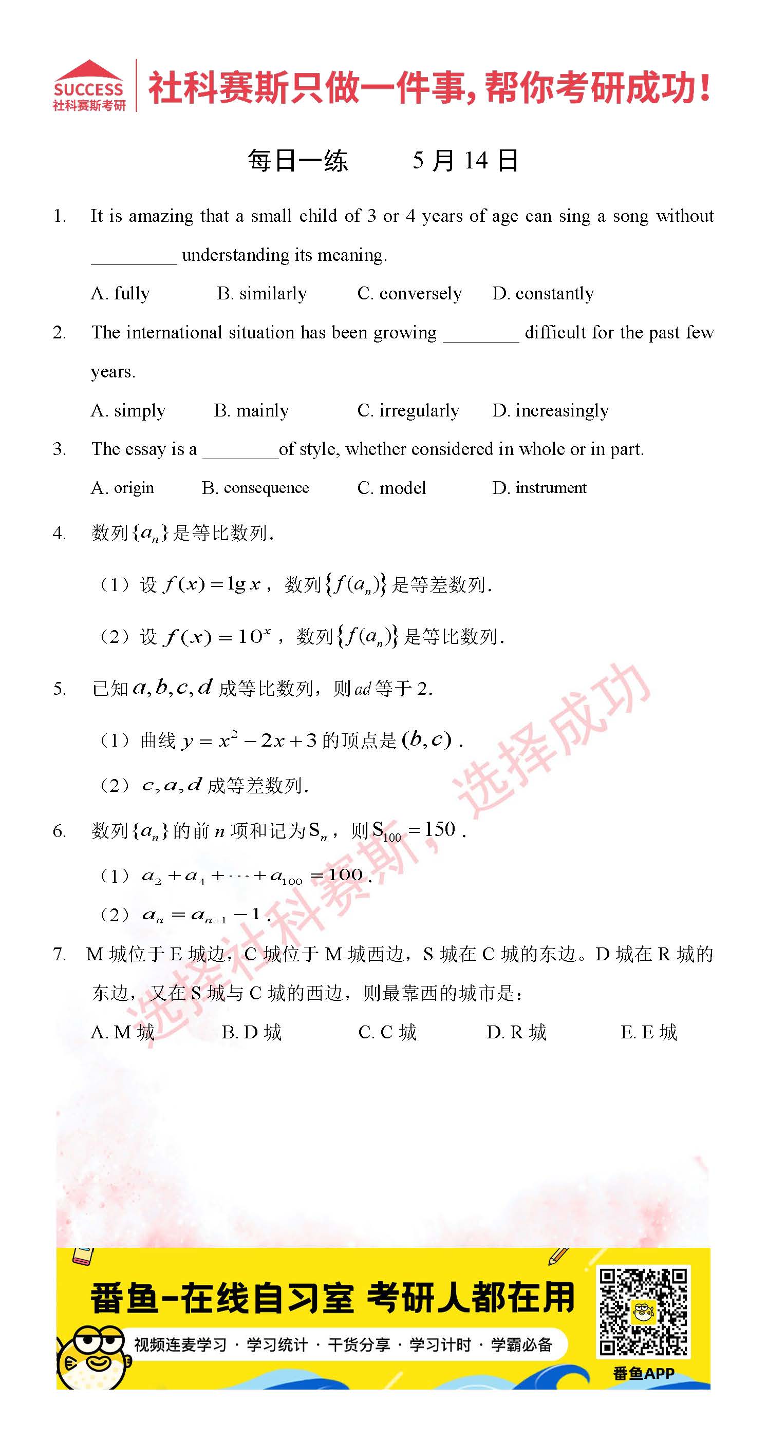 考研是一場(chǎng)持久戰(zhàn),保持良好的學(xué)習(xí)習(xí)慣,是能確保復(fù)習(xí)高效的關(guān)鍵。今天社科賽斯考研網(wǎng)小編整理了“2022考研每日一練:5月14管理類(lèi)聯(lián)考每日一練及答案”的內(nèi)容,希望能對(duì)廣大考生有所幫助。