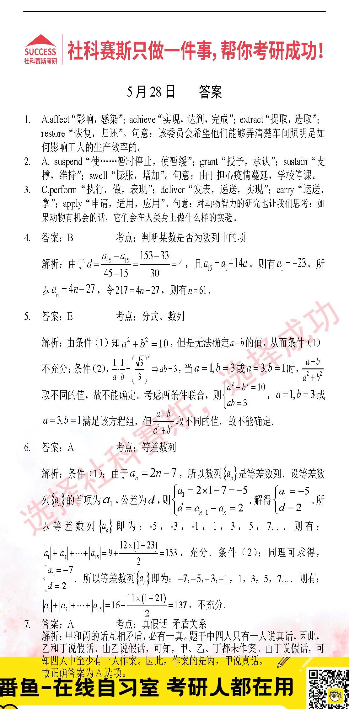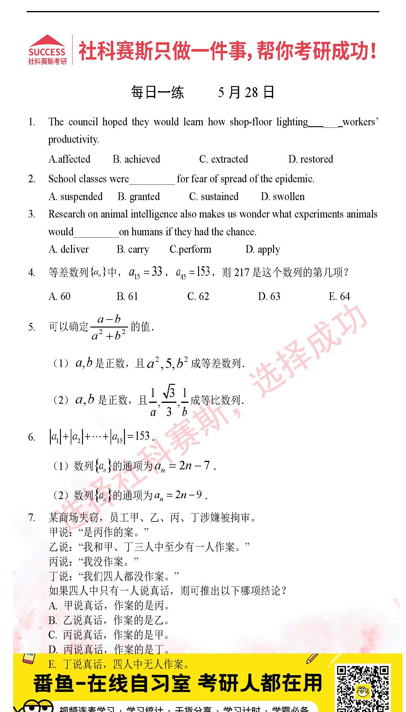 以上就是社科賽斯考研網(wǎng)小編為大家整理2022考研每日一練:5月28日管理類聯(lián)考每日一練及答案的全部內(nèi)容,希望各位考生堅持利用起來,更多每日一練內(nèi)容請持續(xù)關(guān)注社科賽斯考研網(wǎng)