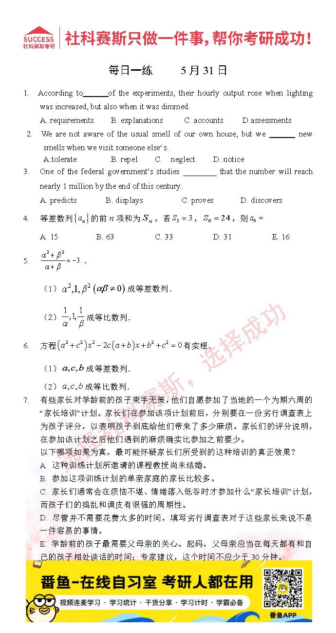 以上就是社科賽斯考研網(wǎng)小編為大家整理2022考研每日一練:5月30日管理類聯(lián)考每日一練及答案的全部內(nèi)容,希望各位考生堅持利用起來,更多每日一練內(nèi)容請持續(xù)關(guān)注社科賽斯考研網(wǎng)