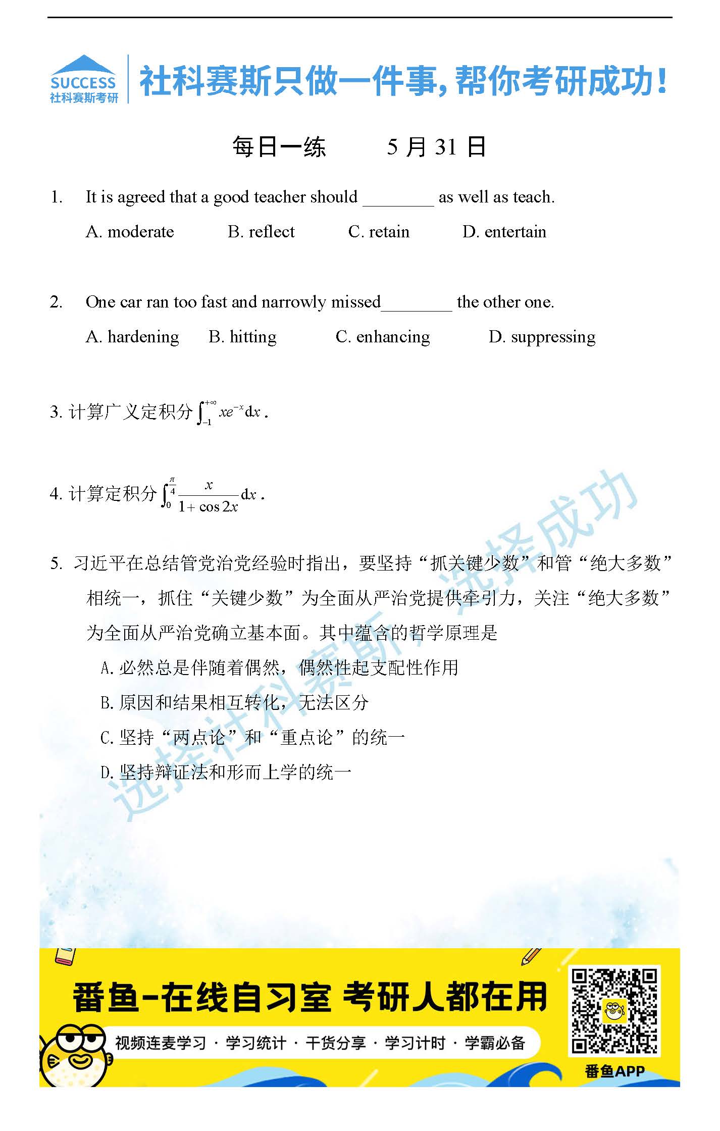 考研是一場持久戰(zhàn),保持良好的學(xué)習(xí)習(xí)慣,是能確保復(fù)習(xí)高效的關(guān)鍵。今天社科賽斯考研網(wǎng)小編整理了“2022考研每日一練:5月30日管理類聯(lián)考每日一練及答案”的內(nèi)容,希望能對廣大考生有所幫助。