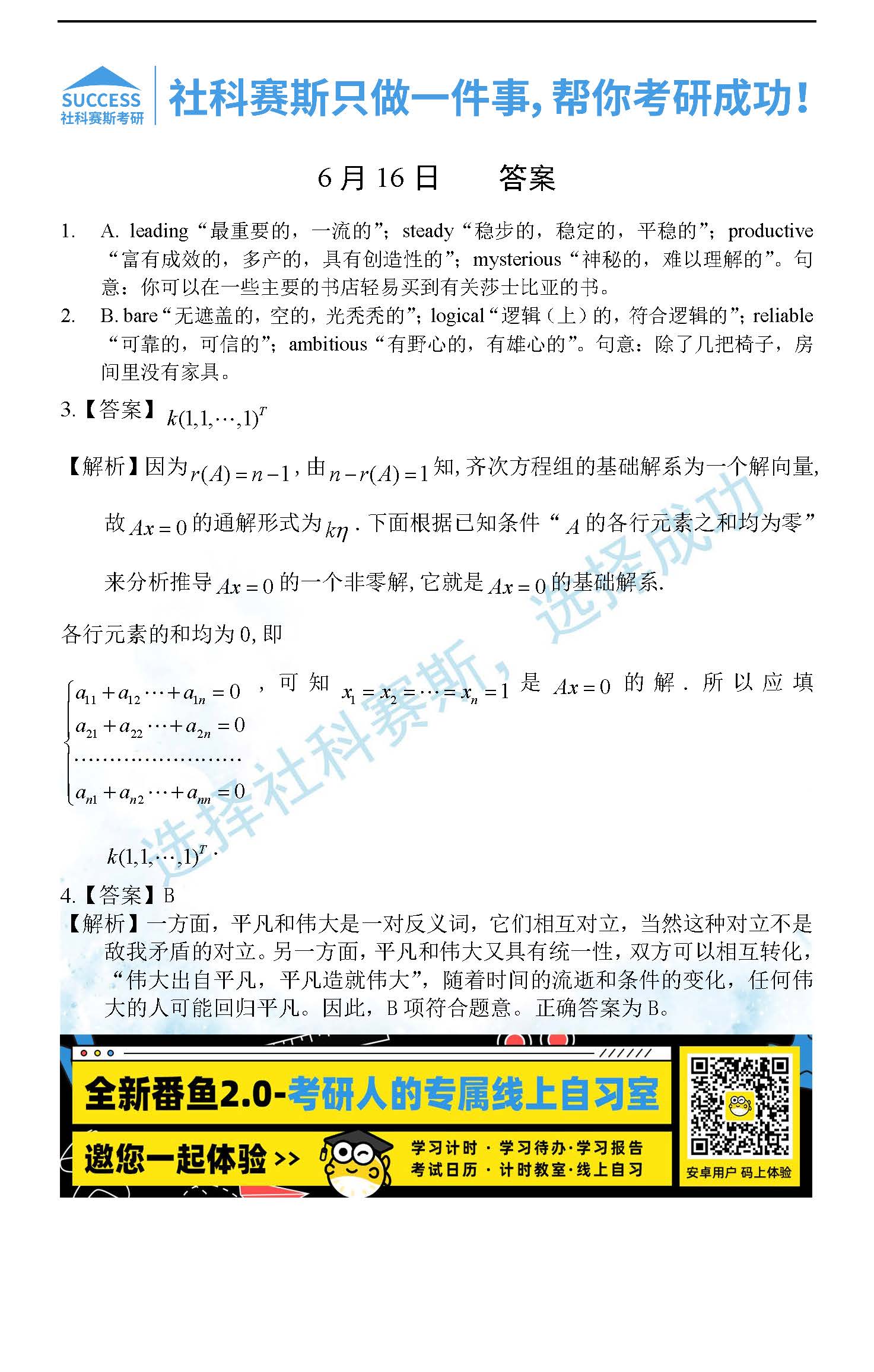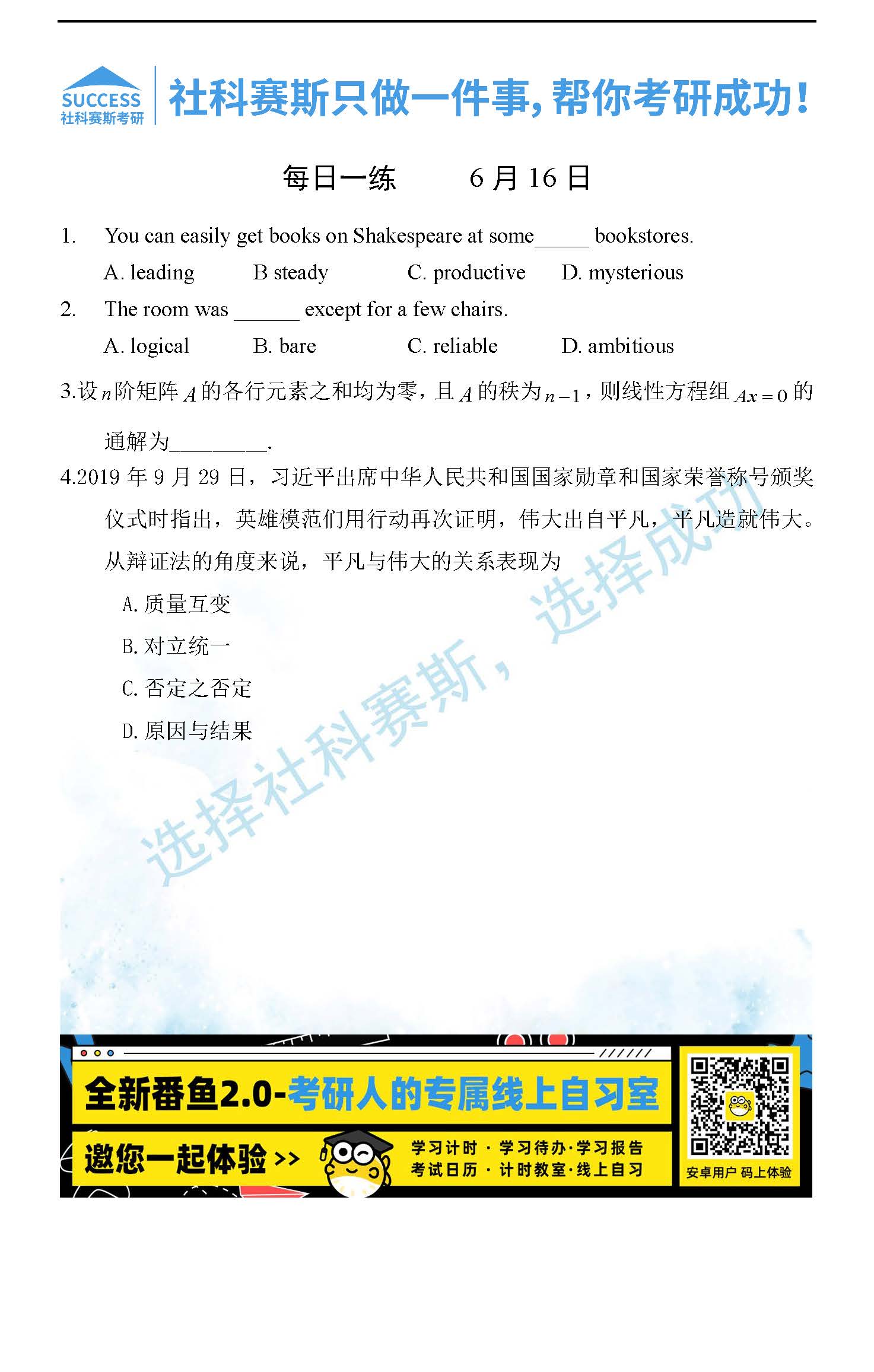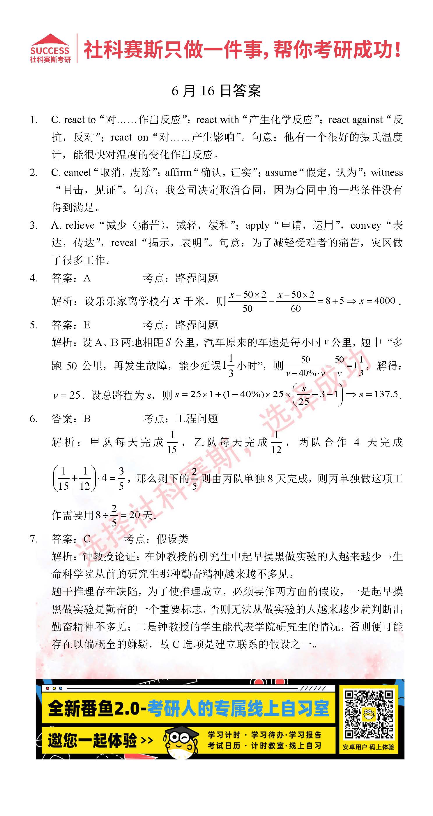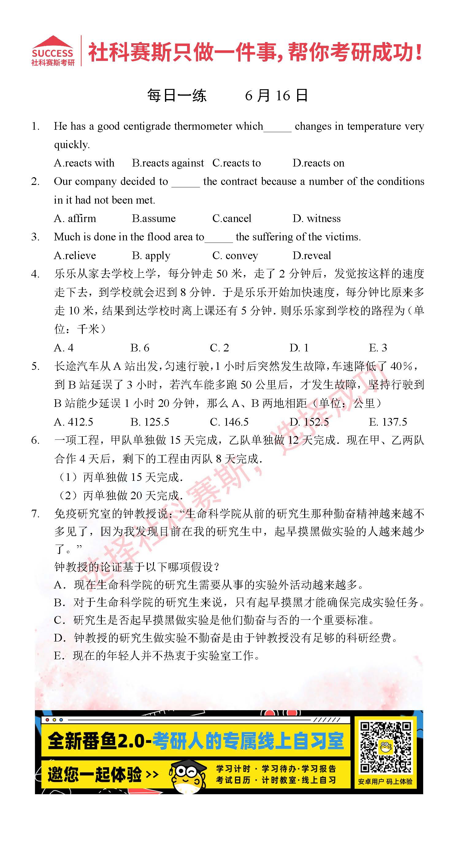 考研是一場持久戰(zhàn),保持良好的學(xué)習(xí)習(xí)慣,是能確保復(fù)習(xí)高效的關(guān)鍵。今天社科賽斯考研網(wǎng)小編整理了“2022考研每日一練:6月16日管理類聯(lián)考每日一練及答案”的內(nèi)容,希望能對廣大考生有所幫助。