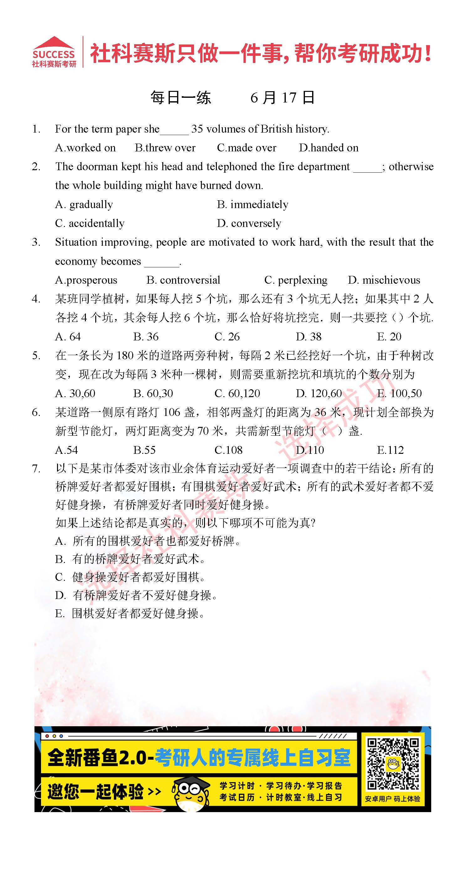 以上就是社科賽斯考研網(wǎng)小編為大家整理2022考研每日一練:6月17日管理類聯(lián)考每日一練及答案的全部內(nèi)容,希望各位考生堅持利用起來,更多每日一練內(nèi)容請持續(xù)關(guān)注社科賽斯考研網(wǎng)。