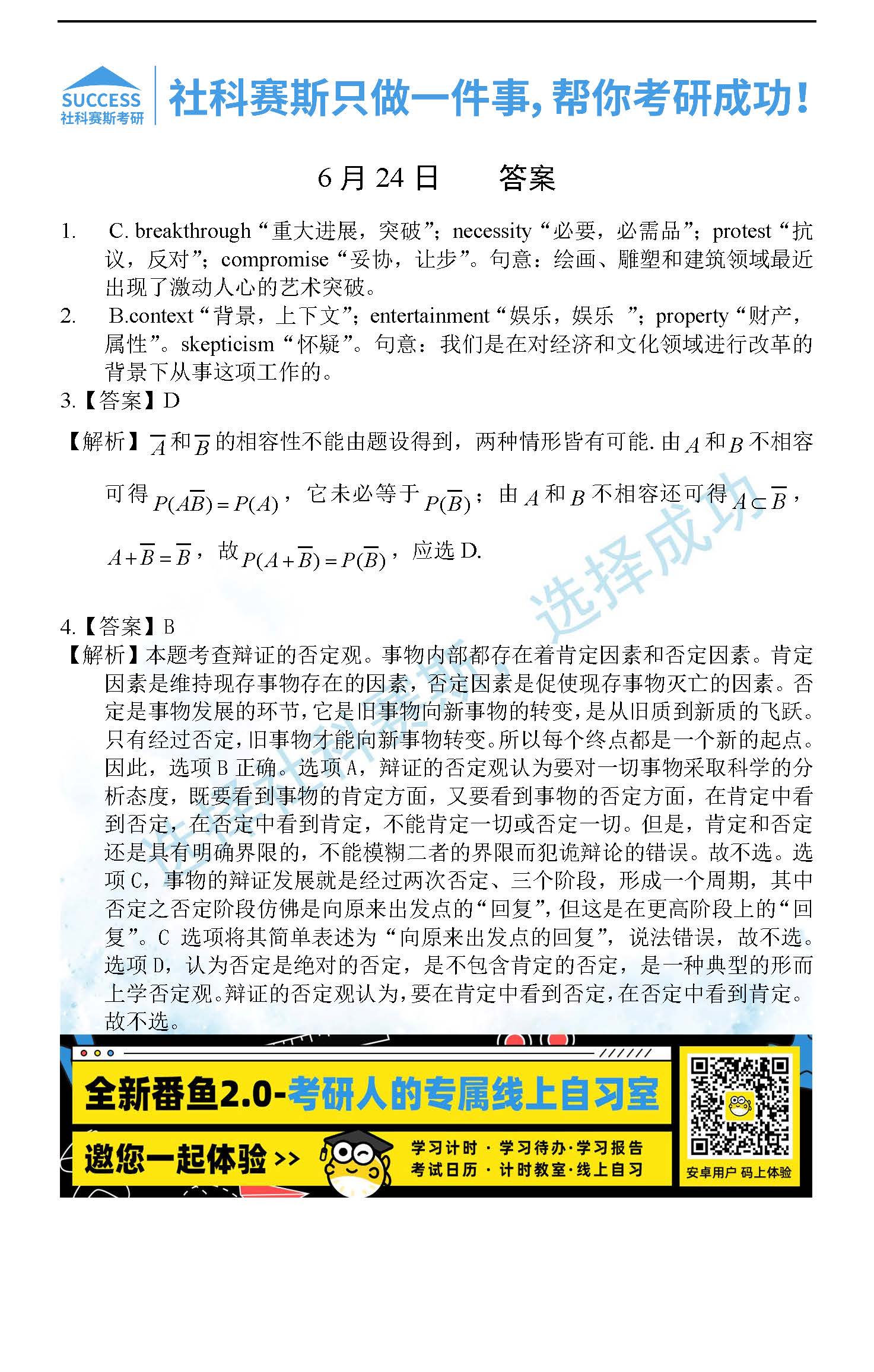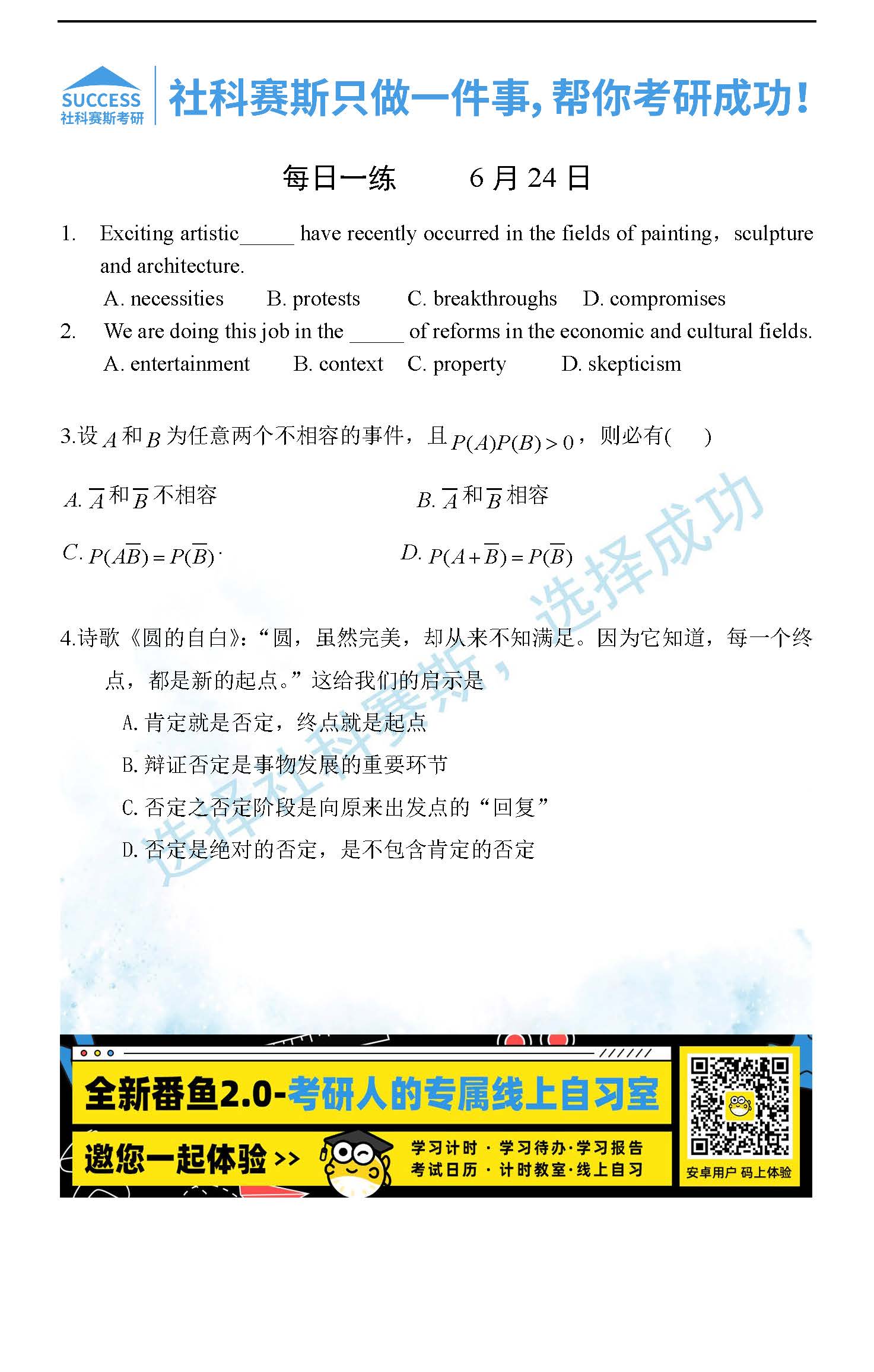 考研是一場持久戰(zhàn),保持良好的學(xué)習(xí)習(xí)慣,是能確保復(fù)習(xí)高效的關(guān)鍵。今天社科賽斯考研網(wǎng)小編整理了“2022考研每日一練:6月24日管理類聯(lián)考每日一練及答案”的內(nèi)容,希望能對廣大考生有所幫助。