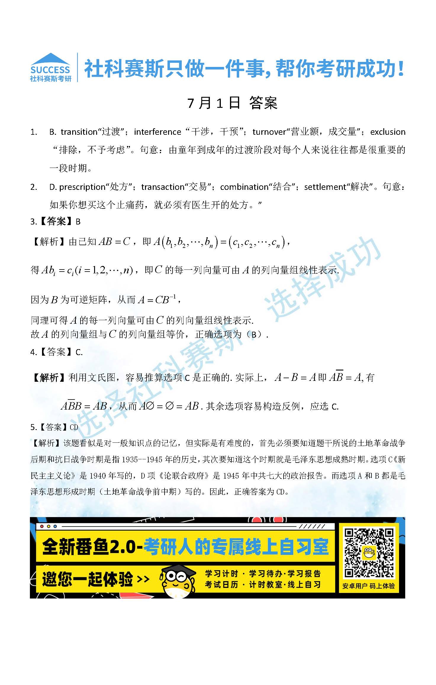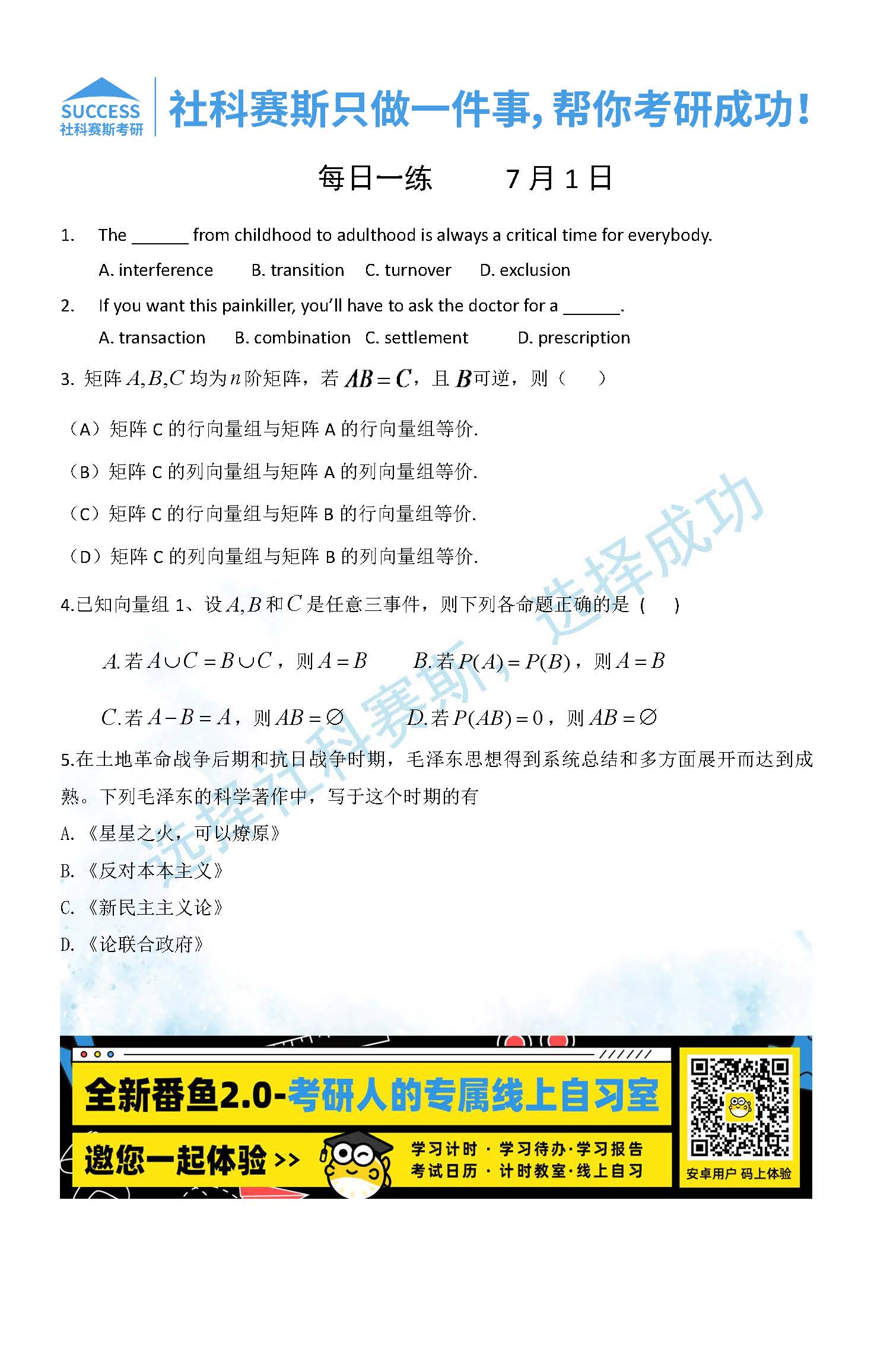以上就是社科賽斯考研網(wǎng)小編為大家整理2022考研每日一練:7月1日管理類聯(lián)考每日一練及答案的全部?jī)?nèi)容,希望各位考生堅(jiān)持利用起來,更多每日一練內(nèi)容請(qǐng)持續(xù)關(guān)注社科賽斯考研網(wǎng)。