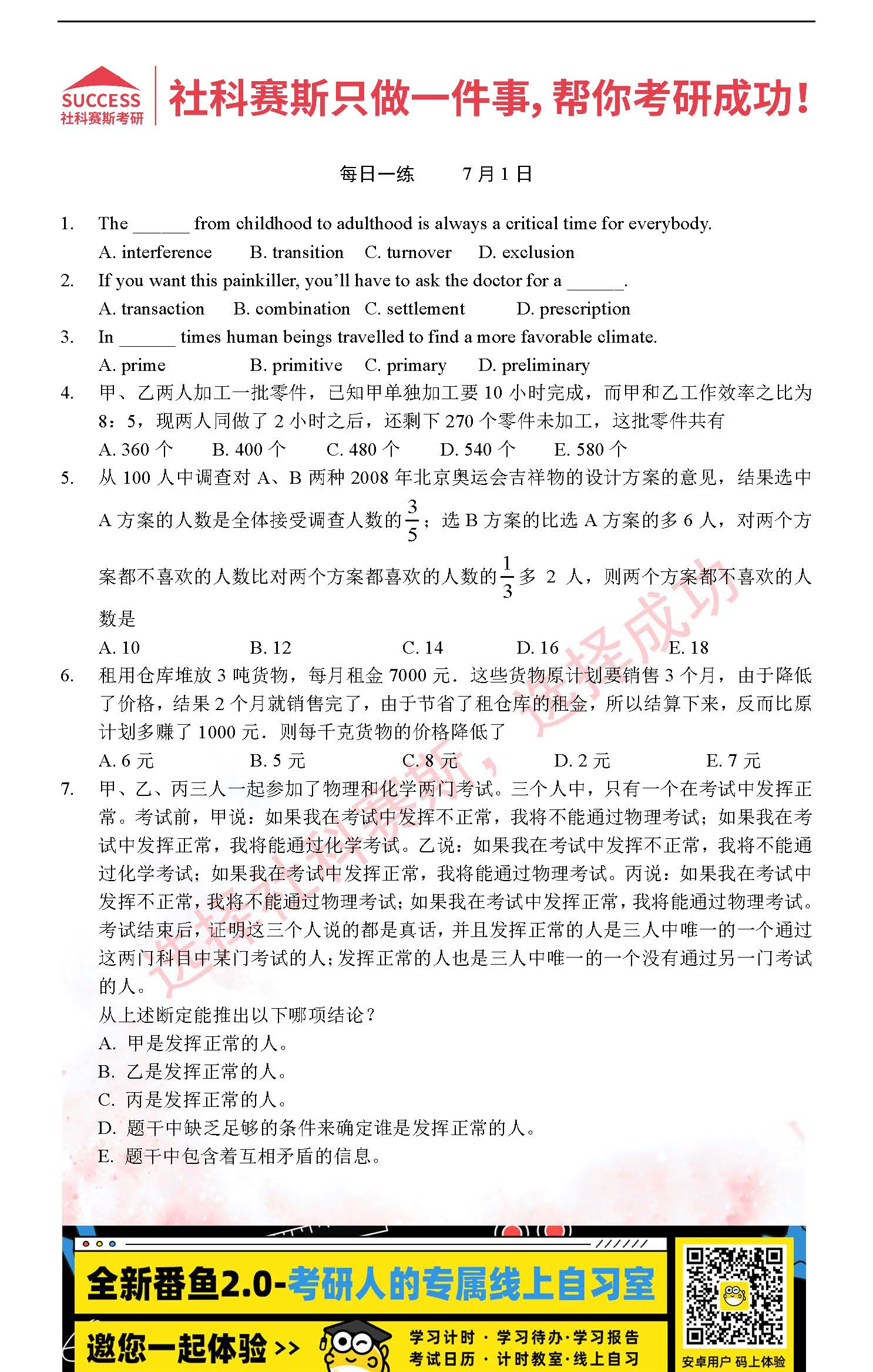 2022考研每日一練:7月1日管理類聯(lián)考每日一練及答案