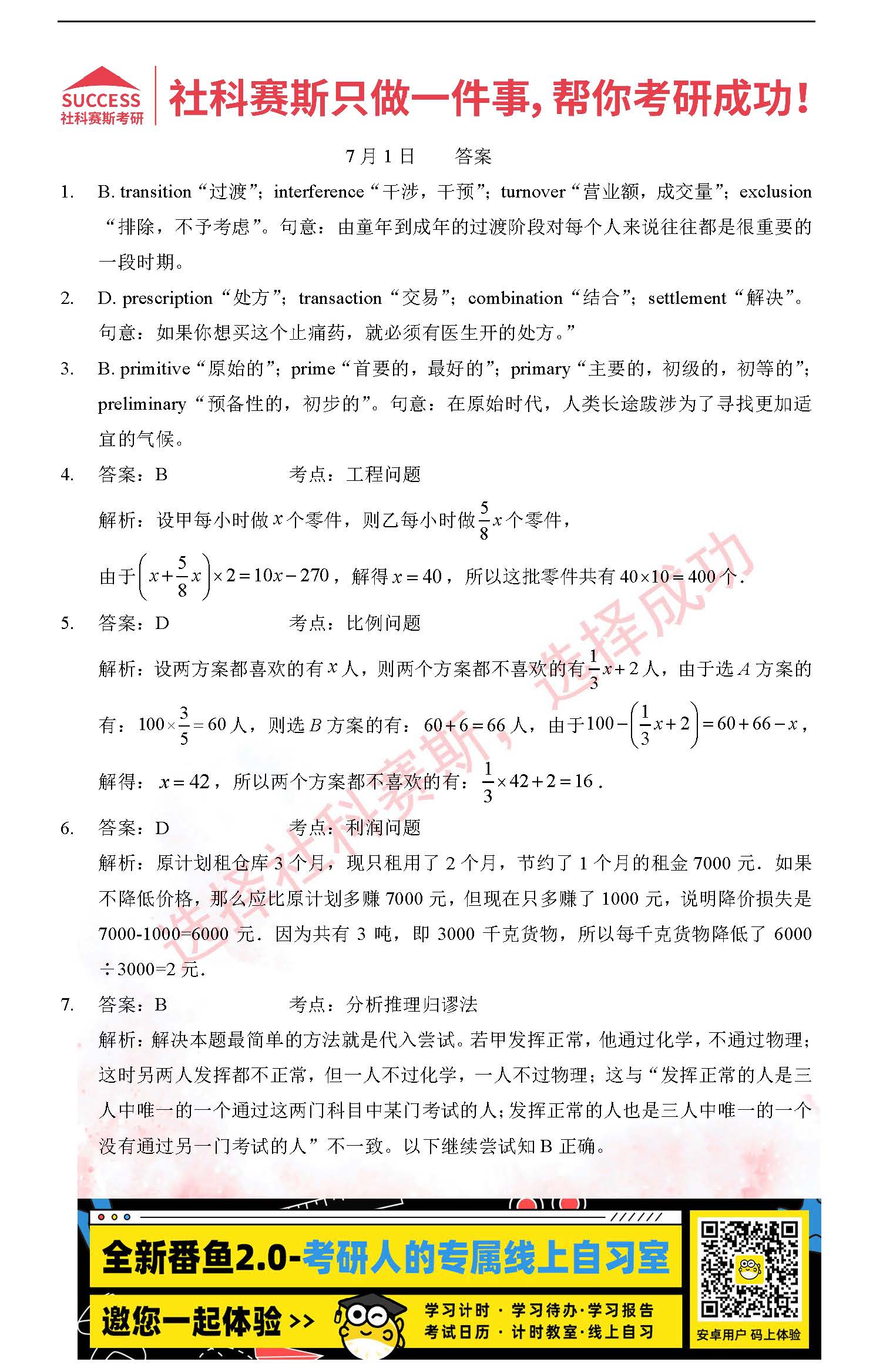 考研是一場(chǎng)持久戰(zhàn),保持良好的學(xué)習(xí)習(xí)慣,是能確保復(fù)習(xí)高效的關(guān)鍵。今天社科賽斯考研網(wǎng)小編整理了“2022考研每日一練:7月1日管理類聯(lián)考每日一練及答案”的內(nèi)容,希望能對(duì)廣大考生有所幫助。