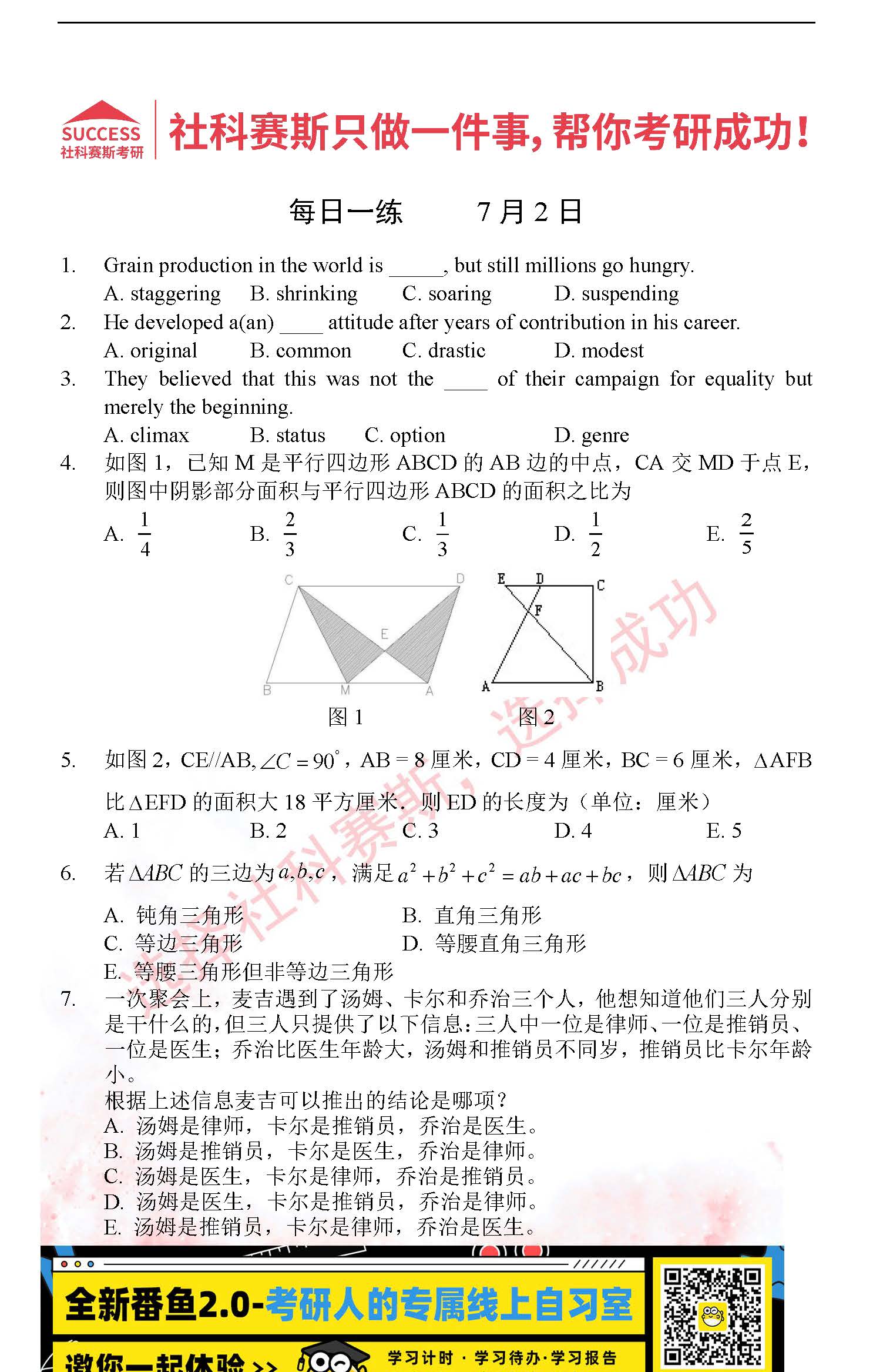 考研是一場持久戰(zhàn),保持良好的學習習慣,是能確保復習高效的關鍵。今天社科賽斯考研網(wǎng)小編整理了“2022考研每日一練:7月2日管理類聯(lián)考每日一練及答案”的內(nèi)容,希望能對廣大考生有所幫助。