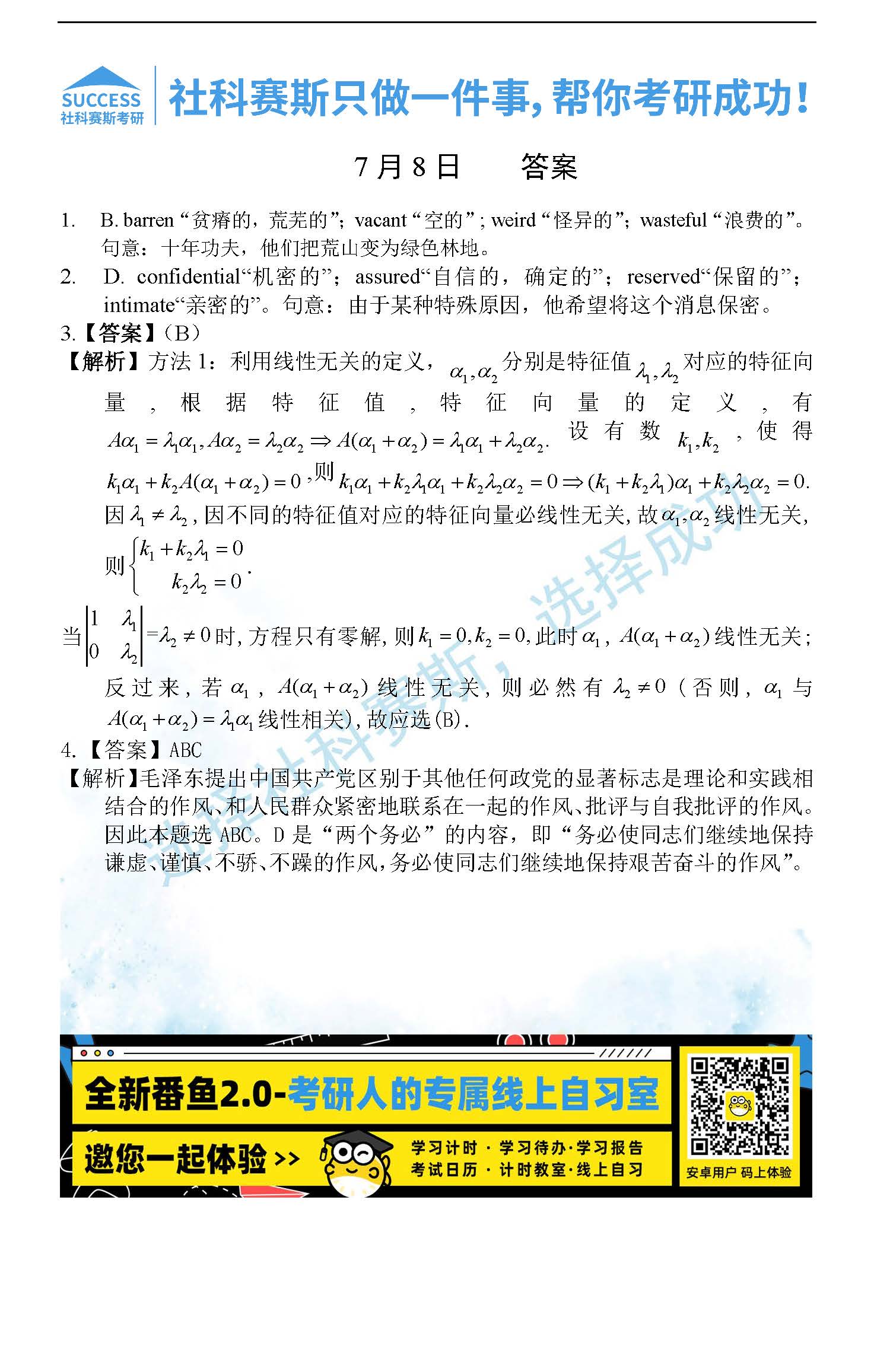 考研是一場持久戰(zhàn),保持良好的學(xué)習(xí)習(xí)慣,是能確保復(fù)習(xí)高效的關(guān)鍵。今天社科賽斯考研網(wǎng)小編整理了“2022考研每日一練:7月8日管理類聯(lián)考每日一練及答案”的內(nèi)容,希望能對廣大考生有所幫助。