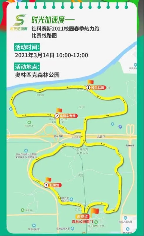 “時光加速度—2021春季校園熱力跑活動”路線全程約10.7公里,奧林匹克森林公園南門即為起點。此外,活動主辦方在賽道上設置了趣味闖關環(huán)節(jié),每當?shù)竭_指定地點,參賽者在指定打卡點完成相應的任務,豐富的內容吸引了大量的參賽者積極參加與,歡聲笑語成為了活動中的主旋律。