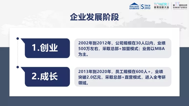當(dāng)我們的主業(yè)占到行業(yè)里的5%,甚至10%、15%,再考慮去做大的賽道。我說過,社科賽斯在整個考研賽道里面,沒做到20個億之前我們是不會換賽道的。20個億,我們再用3年、5年做得好的話有可能實(shí)現(xiàn),這當(dāng)然是我們的夢想,有可能還做不到。3年、5年之后,考研賽道整個盤子應(yīng)該會達(dá)到200億,甚至300億。那么20億相對于300億,也就百分之五六。現(xiàn)在千萬不要連1%、2%都沒有做到的情況下,就考慮擴(kuò)張,那樣的情況很難成功。