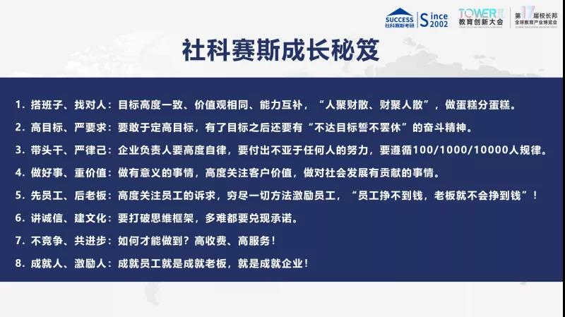 第七點(diǎn)叫“不競爭、共進(jìn)步”。企業(yè)現(xiàn)在競爭這么激烈,而我們講究的是不競爭,原因是什么?因?yàn)槲覀冞@個市場足夠大。我說的足夠大,是跟我們自身的體量去比的。社科賽斯作為一家專注考研的機(jī)構(gòu),在整個市場占有率上面,也就占了百分之二、三。天花板還很高,無論有多少家企業(yè),我們從來不會發(fā)生正面的競爭。