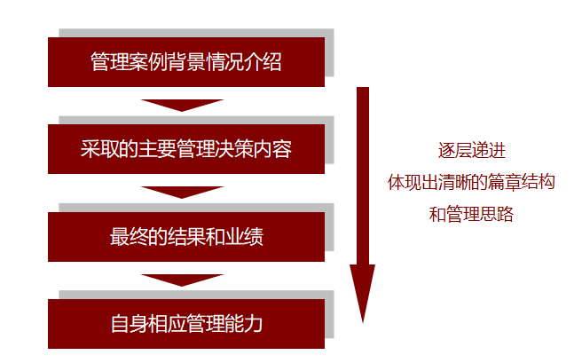本文的實(shí)際案例部分對(duì)整體的材料審核打分也很關(guān)鍵,申請(qǐng)人應(yīng)當(dāng)注意以下核心問題:(1)切忌寫成流水賬,應(yīng)當(dāng)按照較為清晰的文章段落篇章架構(gòu);(2)應(yīng)當(dāng)有較為清晰的管理決策內(nèi)容和管理思路;(3)實(shí)際案例應(yīng)當(dāng)體現(xiàn)出深刻的管理思維和出眾的管理決策能力;(4)內(nèi)容切忌空洞,應(yīng)當(dāng)有較為豐富、切實(shí)的管理情境和行業(yè)背景的體現(xiàn)