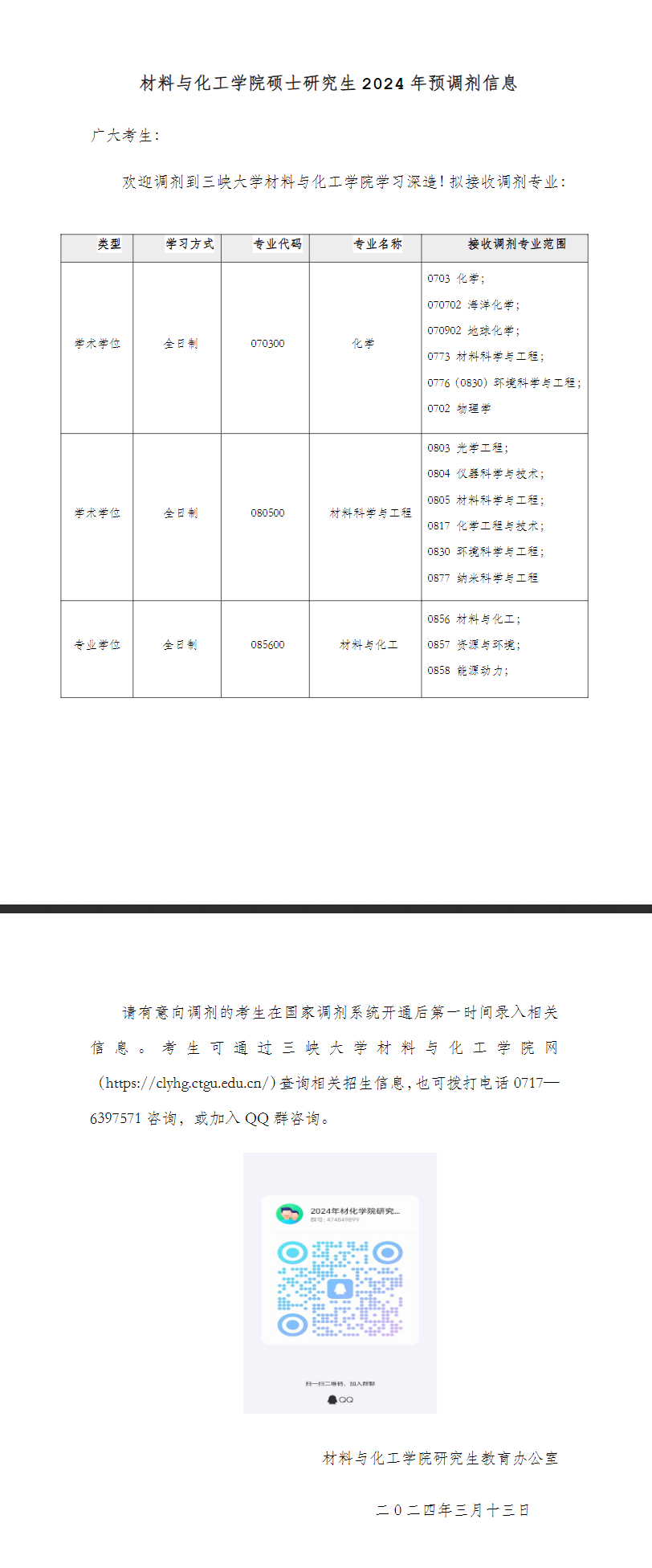 2024考研預(yù)調(diào)劑:三峽大學(xué)材料與化工學(xué)院碩士研究生2024年預(yù)調(diào)劑信息