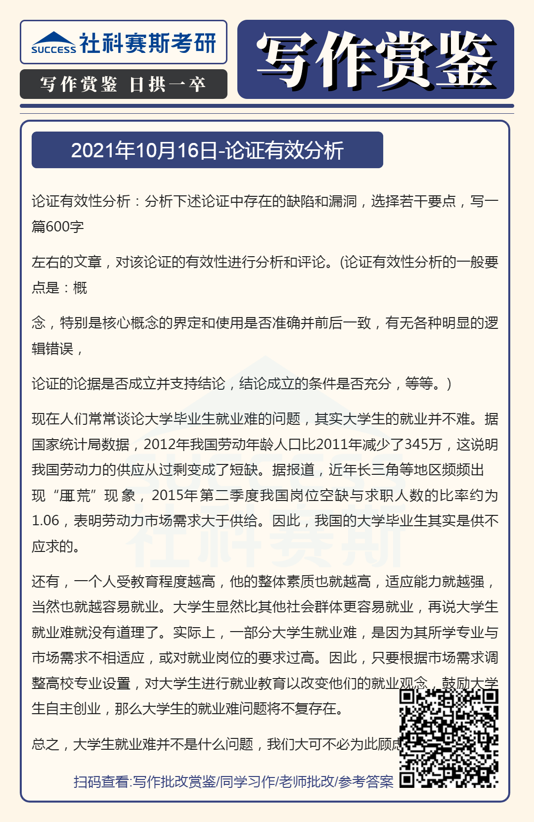以上就是小編為大家整理“管理類聯(lián)考寫作備考:10月16日寫作鑒賞及答案”的全部?jī)?nèi)容,希望各位考生堅(jiān)持利用起來,想要獲取更多內(nèi)容請(qǐng)持續(xù)關(guān)注社科塞斯考研網(wǎng)。