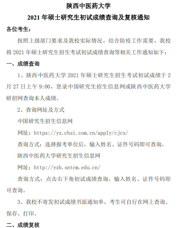 點(diǎn)擊查看 陜西中醫(yī)藥大學(xué)2021年碩士研究生初試成績查詢及復(fù)核通知