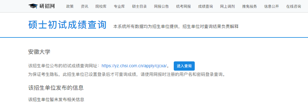 安徽大學(xué)考研初試成績(jī)查詢(xún)?nèi)肟?/span>https://yz.chsi.com.cn/apply/cjcx/sch/10357.dhtml