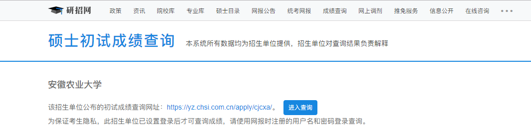 安徽農(nóng)業(yè)大學考研初試成績查詢?nèi)肟?/span>https://yz.chsi.com.cn/apply/cjcx/sch/10364.dhtml