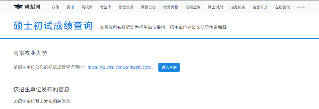 南京農業(yè)大學考研初試成績查詢入口https://yz.chsi.com.cn/apply/cjcx/sch/10307.dhtml