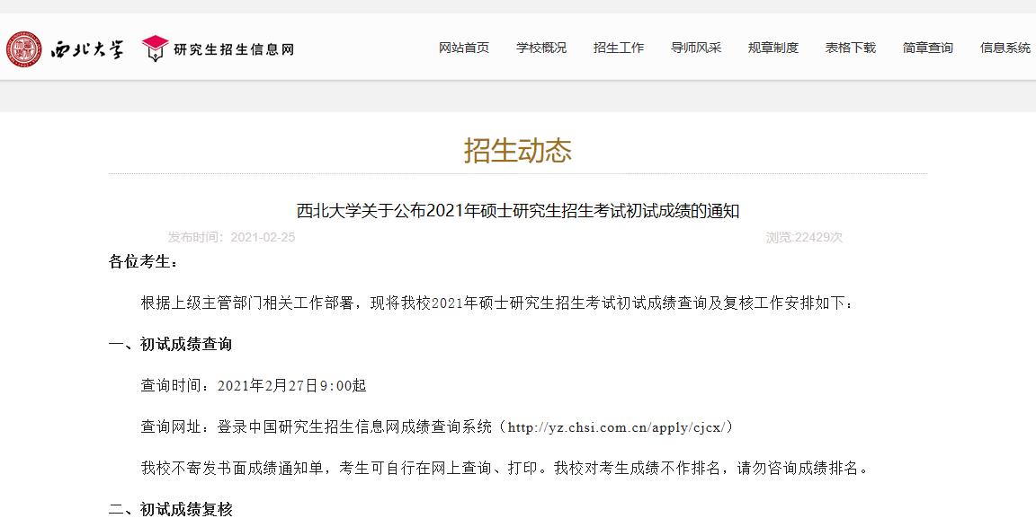 2021考研初試成績:西北大學(xué)考研初試成績查詢?nèi)肟陂_啟!初試成績已公布!