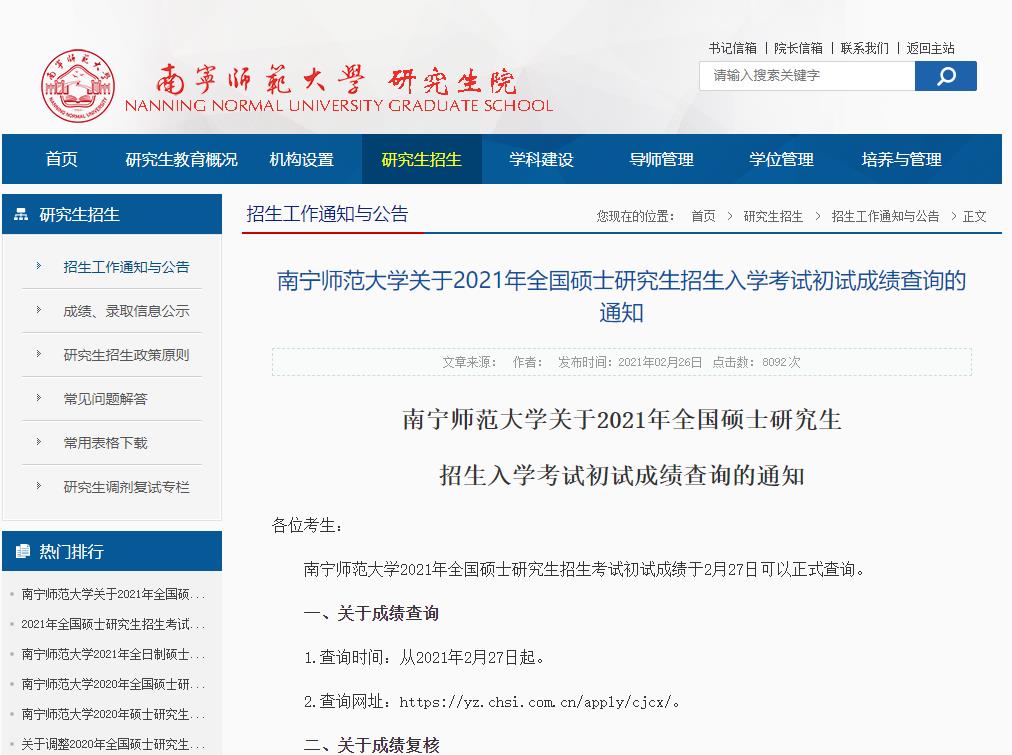 南寧師范大學(xué)考研初試成績(jī)查詢?nèi)肟?/span>:https://yjsxy.nnnu.edu.cn/info/1021/1971.htm