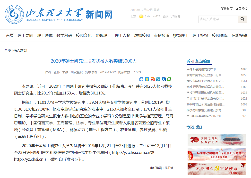 2020考研報名人數(shù)|山東理工大學2020年碩士研究生報考人數(shù)突破5000人,比2019年增加1163人,增幅為30.11%”的相關(guān)新聞內(nèi)容,大家可以了解一下哦!