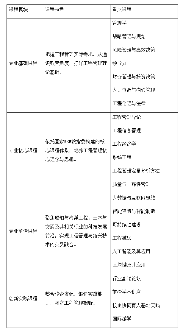 招生領域:包括但不限于船舶與海洋工程、土木工程、交通運輸工程、水利工程、港口航道工程管理、房地產(chǎn)、工程咨詢、工程造價、工程全過程管理等,以及相關行業(yè)。