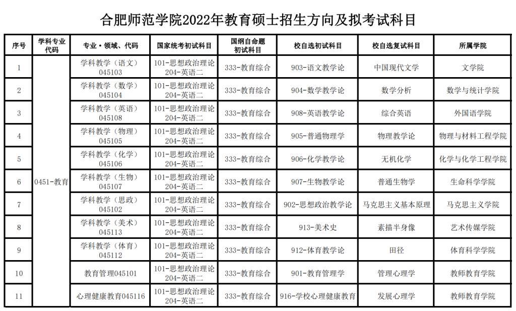 合肥師范學(xué)院2022年教育碩士招生考試科目后期在我校研究生處網(wǎng)頁招生欄目公布。