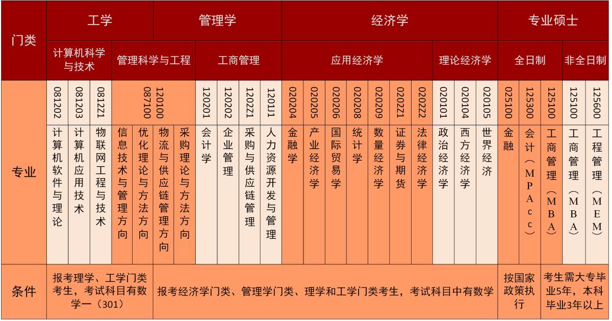 目前我校擁有應(yīng)用經(jīng)濟學(xué)、理論經(jīng)濟學(xué)、管理科學(xué)與工程、工商管理、計算機科學(xué)與技術(shù)共5個一級學(xué)科碩士學(xué)位授權(quán),下設(shè)22個二級學(xué)科(研究方向)碩士學(xué)位授予權(quán)。我校還擁有金融專碩、會計專碩(MPAcc)、工商管理碩士(MBA)、工程管理碩士(MEM)(物流工程方向)4個專業(yè)學(xué)位碩士培養(yǎng)類別。具體招生專業(yè)和方向如下圖所示: