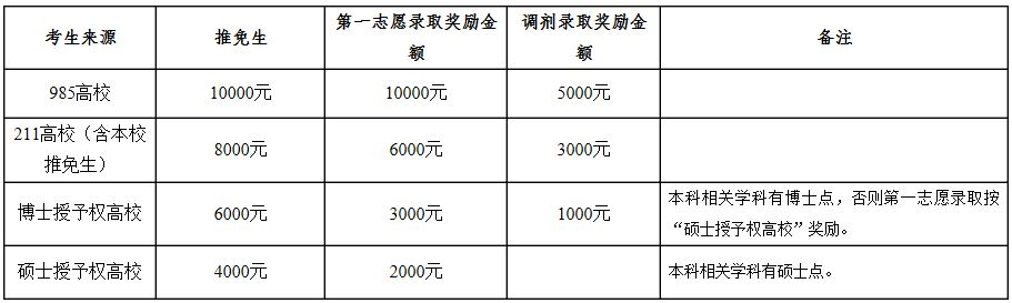 (1)生源獎學(xué)金:從2014年起,對達(dá)到國家復(fù)試分?jǐn)?shù)要求并被我校錄取的非定向碩士研究生給予一次性入學(xué)獎勵。獎勵標(biāo)準(zhǔn)如下: