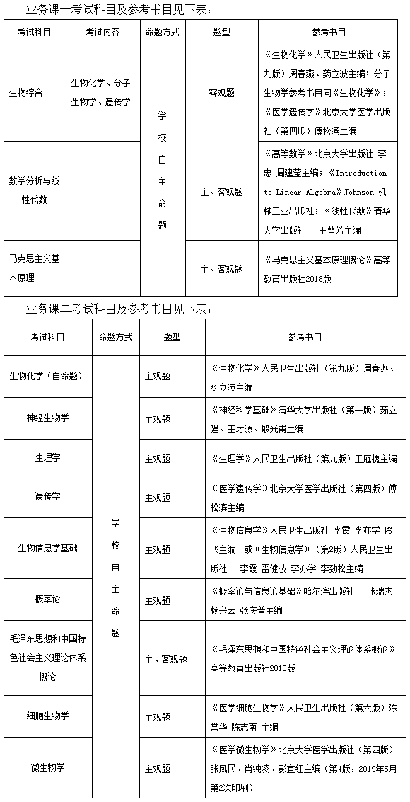 ③理學(xué)門(mén)類中生物學(xué)一級(jí)學(xué)科所涵蓋的所有二級(jí)學(xué)科(生理學(xué)、微生物學(xué)、神經(jīng)生物學(xué)、遺傳學(xué)、發(fā)育生物學(xué)、細(xì)胞生物學(xué)、生物化學(xué)與分子生物學(xué)、生物物理學(xué))、生物醫(yī)學(xué)工程一級(jí)學(xué)科、工程碩士(生物醫(yī)學(xué)工程)和法學(xué)門(mén)類的思想政治教育專業(yè),初試科目仍為四門(mén),第三門(mén)為業(yè)務(wù)課一考試科目(150分),第四門(mén)為業(yè)務(wù)課二考試科目(150分)。