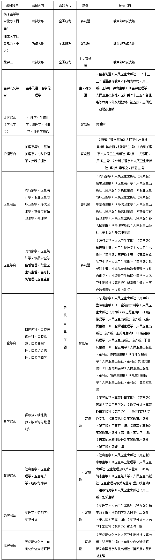 醫(yī)學(xué)門(mén)類專業(yè)基礎(chǔ)綜合考試科目及參考書(shū)目等見(jiàn)下表: