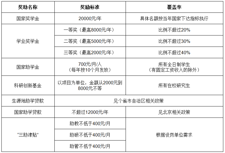 2. 根據(jù)北京市財(cái)政局、北京市教育委員會(huì)制定的《北京市研究生國(guó)家獎(jiǎng)學(xué)金、學(xué)業(yè)獎(jiǎng)學(xué)金、國(guó)家助學(xué)金管理暫行辦法》(京財(cái)教育〔2013〕2199號(hào)),我校面向全日制研究生設(shè)置有國(guó)家獎(jiǎng)學(xué)金、學(xué)業(yè)獎(jiǎng)學(xué)金和助學(xué)金,國(guó)家獎(jiǎng)學(xué)金和學(xué)業(yè)獎(jiǎng)學(xué)金按照獎(jiǎng)學(xué)金評(píng)選辦法進(jìn)行評(píng)選,助學(xué)金面向非定向就業(yè)學(xué)生。同時(shí),學(xué)院設(shè)置研究生“三助”崗位,為研究生提供勤工助學(xué)機(jī)會(huì)。
