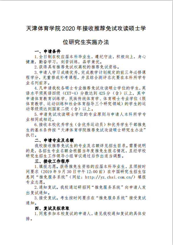 天津體育學(xué)院2020年接收推薦免試攻讀碩士學(xué)位研究生實施辦法