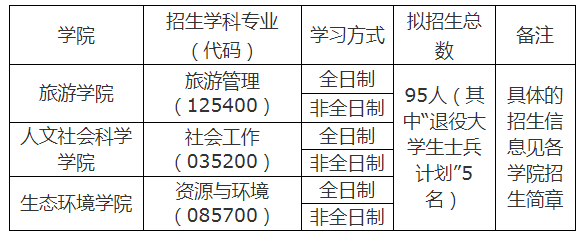我校旅游管理、社會工作、資源與環(huán)境3個碩士專業(yè)學(xué)位的報考條件、招生對象、初試科目、學(xué)費標(biāo)準(zhǔn)、學(xué)習(xí)方式及學(xué)制等相關(guān)信息見各學(xué)院的招生簡章。