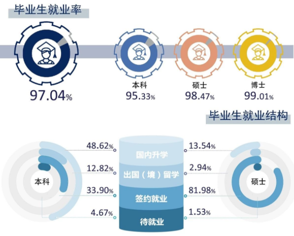 2019年畢業(yè)生共7865人,碩士畢業(yè)生3330人,占比42.34%,男女生比例:1.82:1。畢業(yè)生就業(yè)率為97.04%,其中碩士畢業(yè)生就業(yè)率為98.47%。