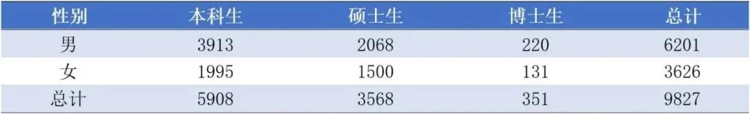 碩士畢業(yè)研究生3568人,男生2068人,女生1500人,畢業(yè)生總體男女比例大約為1.7:1。