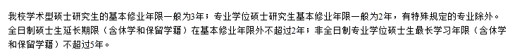 學(xué)制:專業(yè)學(xué)位碩士研究生基本修業(yè)年限為2年,非全日制專業(yè)學(xué)位碩士碩士生最長學(xué)習(xí)年限(含休學(xué)和保留學(xué)籍)不超過5年。