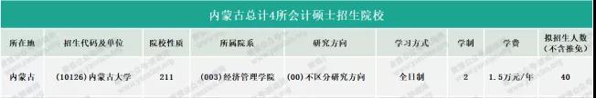 內(nèi)蒙古大學(xué)全日制會計專碩學(xué)制學(xué)費:學(xué)制為2年,2020年學(xué)費為1.5萬元/年