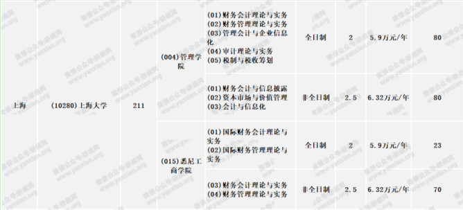 上海大學(xué)全日制會(huì)計(jì)專碩學(xué)制學(xué)費(fèi):學(xué)制為2年,2020年學(xué)費(fèi)為5.9萬(wàn)元/年;非全日制會(huì)計(jì)專碩學(xué)制學(xué)費(fèi):學(xué)制為2.5年,2020年學(xué)費(fèi)為6.32萬(wàn)元/年