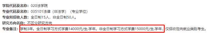 法碩(非法學(xué))全日制:學(xué)制為3年,學(xué)費14000元/生/年