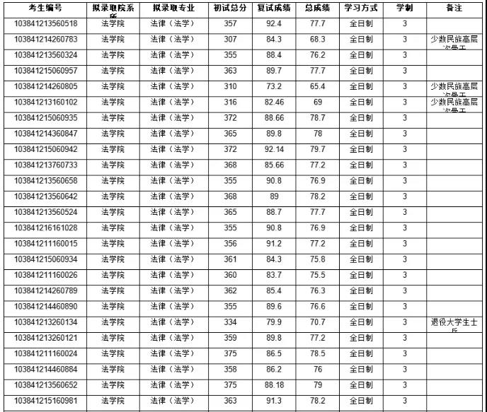 統(tǒng)考全日制法本法碩最高分384分,最低分355分。非全日制考生一共錄取10名,最高分351分,最低分325分。