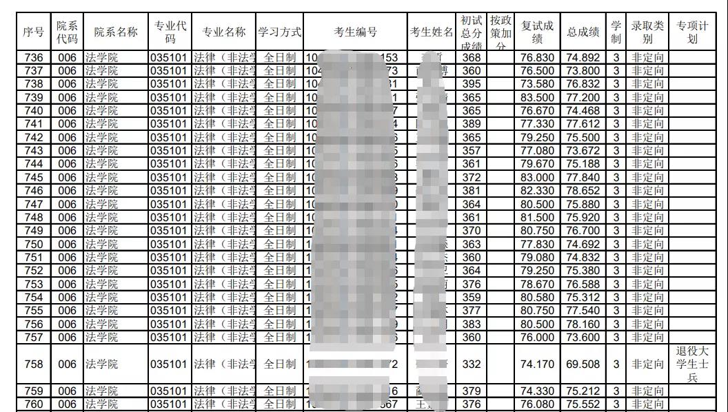 法律(非法學(xué)):全日制錄取69人,最高分397分,最低分356分;