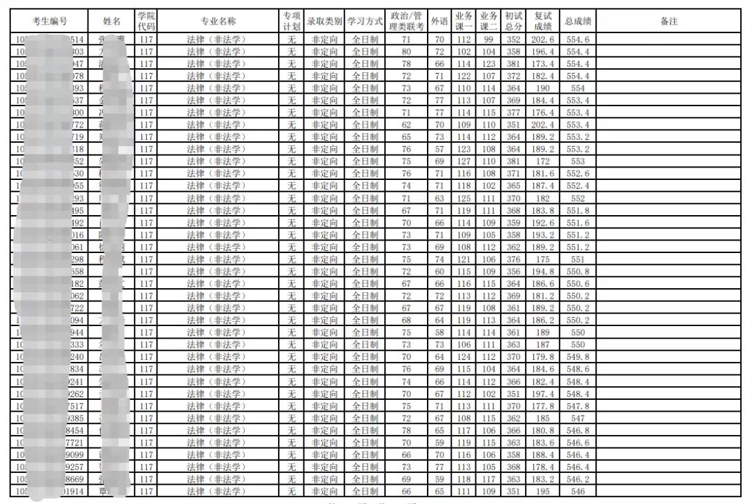 法律(非法學):全日制錄取215人,最高分393分,最低分349分;