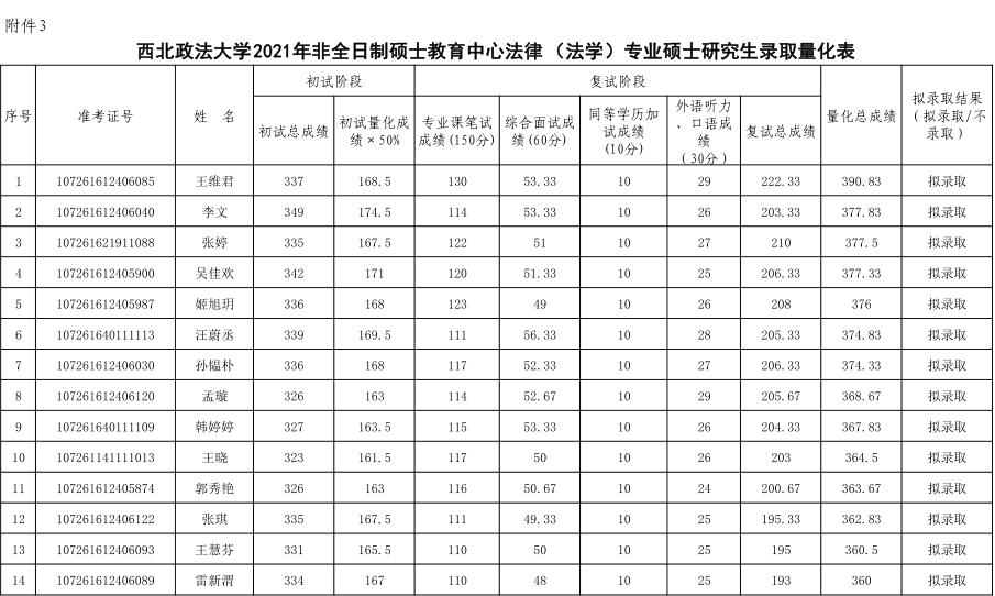 西北政法大學(xué)2021年法律碩士擬錄取情況: