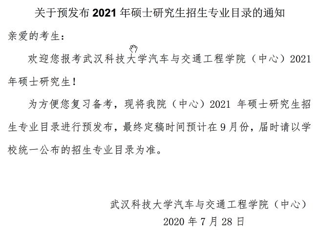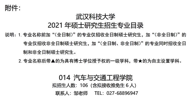 以上就是“2021考研專業(yè)目錄:武漢科技大學(xué)汽車與交通工程學(xué)院2021年碩士研究生招生專業(yè)目錄”的全部?jī)?nèi)容!祝您考研成功!