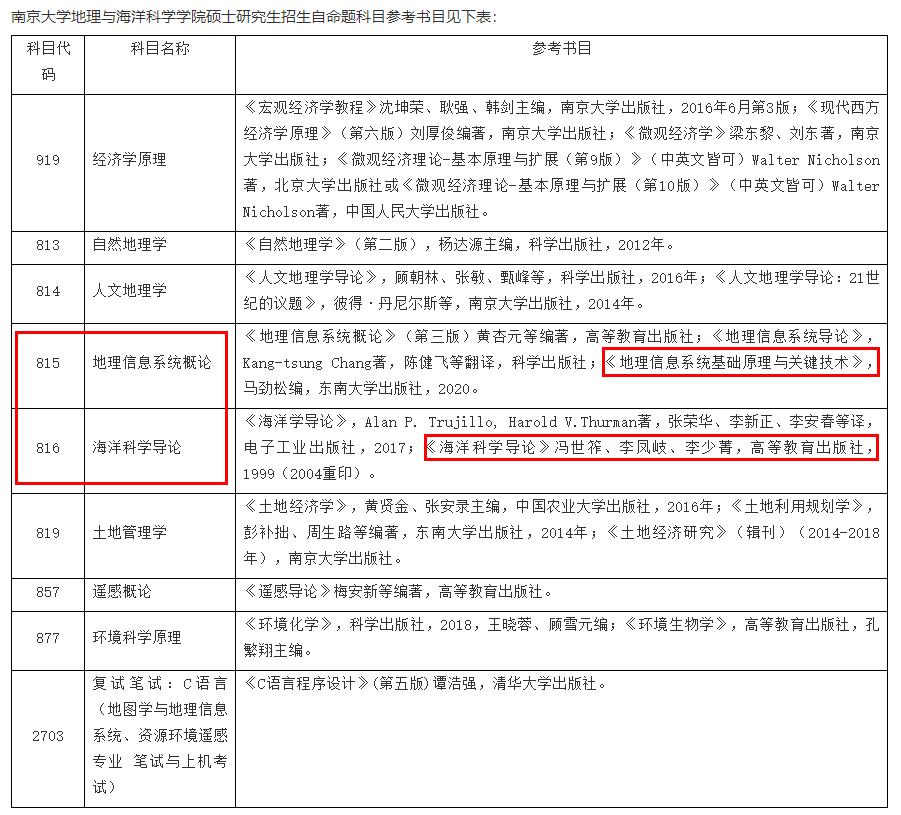 南京大學地理與海洋科學學院關于初試科目《地理信息系統(tǒng)概論》和《海洋科學導論》的參考書目各添加了一本: