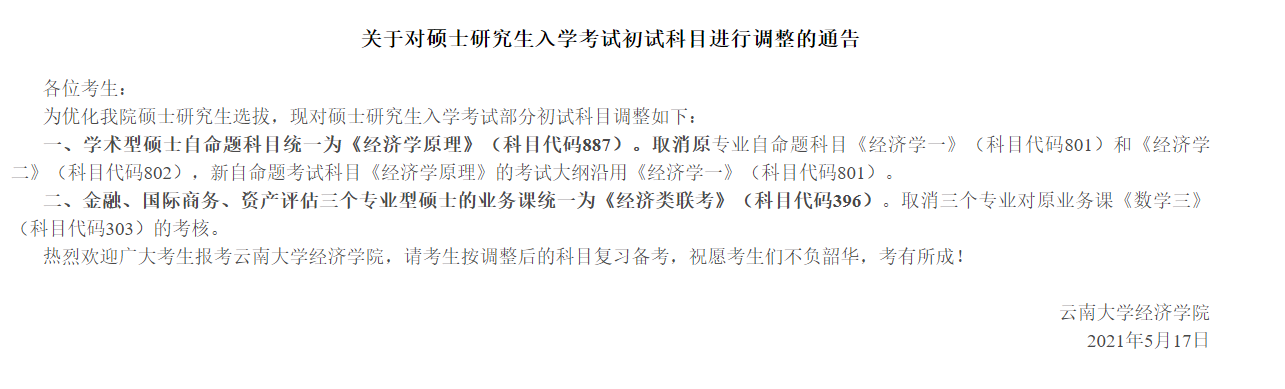 點(diǎn)擊查看:云南大學(xué)經(jīng)濟(jì)學(xué)院關(guān)于對(duì)2022年碩士研究生入學(xué)考試初試科目進(jìn)行調(diào)整的通告