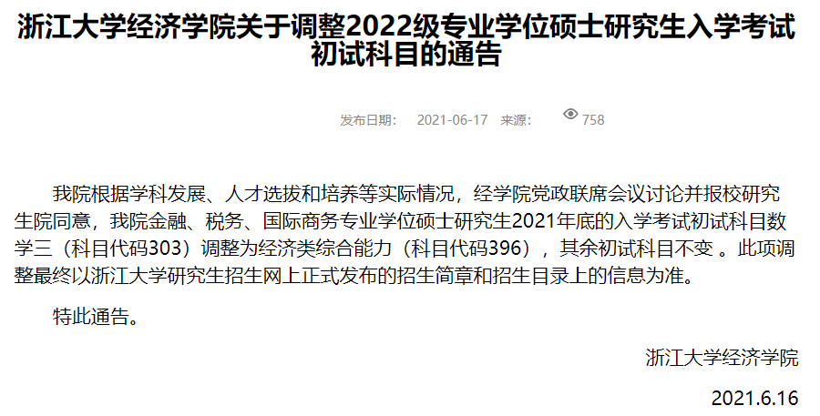 原文標(biāo)題:浙江大學(xué)經(jīng)濟(jì)學(xué)院關(guān)于調(diào)整2022級專業(yè)學(xué)位碩士研究生入學(xué)考試初試科目的通告