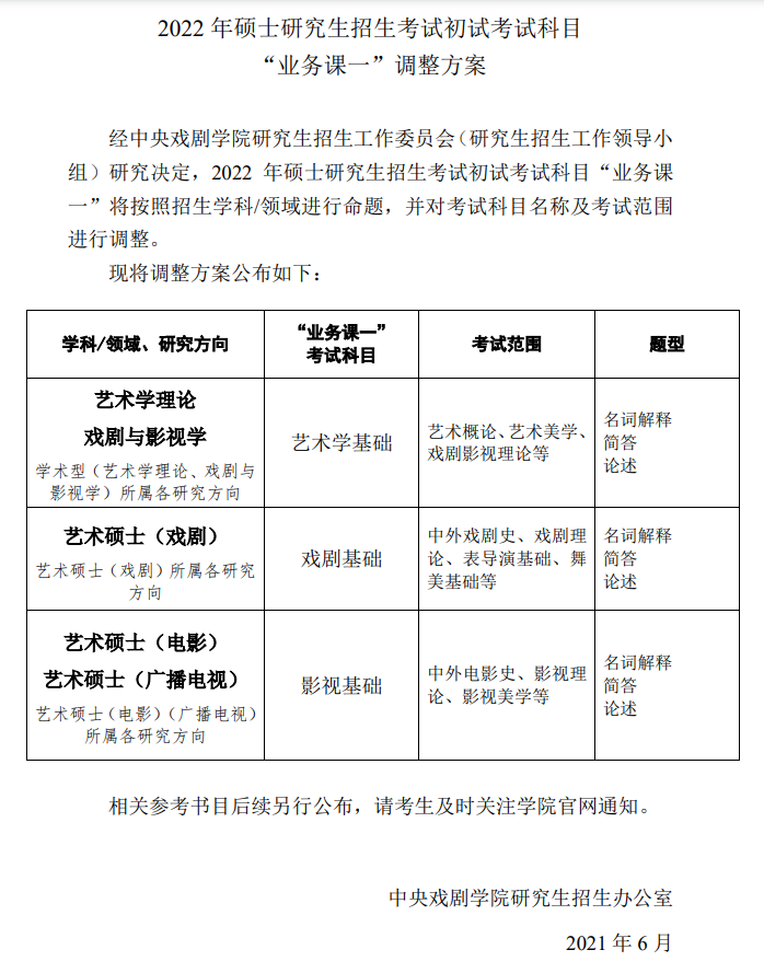2022考研科目調(diào)整:中央戲劇學(xué)院調(diào)整 2022 年碩士研究生招生考試初試考試科目“業(yè)務(wù)課一” 調(diào)整方案